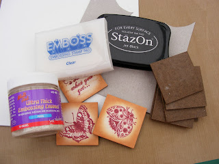 I love working with Stampbord so inking and stamping the tiles before covering them in UTEE was a real pleasure to do. I do have a question for any Stampbord experts though. I really enjoy doing the highlights with a scratch tool but even though I usually give the piece a blast of the heatgun to make sure the ink is thoroughly dry, as soon as I cover it with UTEE the highlights just about disappear and it really annoys me. If anyone has a tip on how to stop this happening I would be grateful to hear it. I actually forgot to sand the edges of my tiles before embossing them, lol!